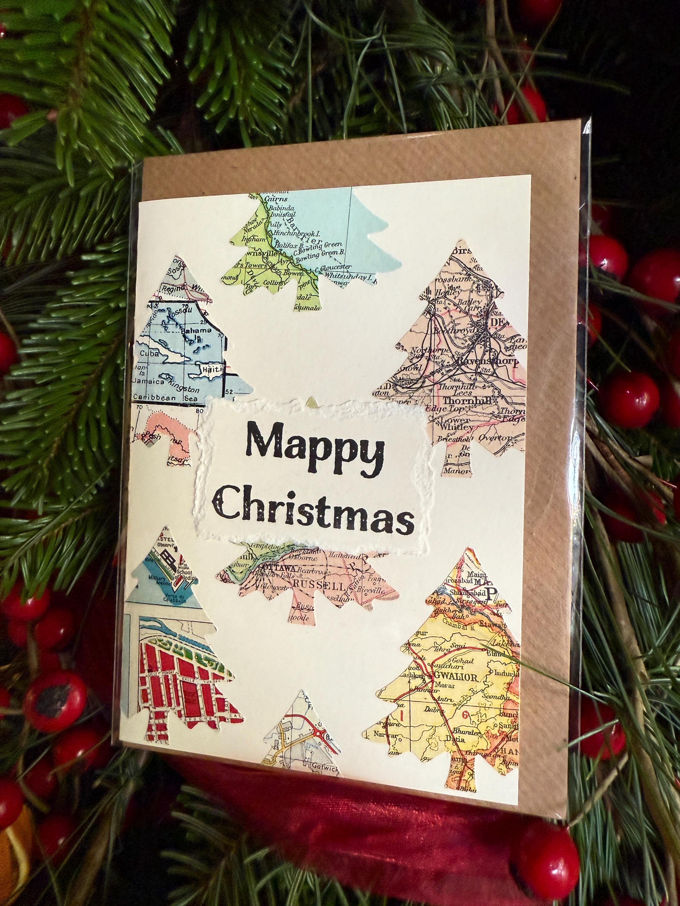 Beautiful handmade card using original vintage map pieces. Embellished with hand stamped 'Mappy Christmas'. All the cards have different map pieces on them and you will be sent a random choice of whatever is in stock at the time.